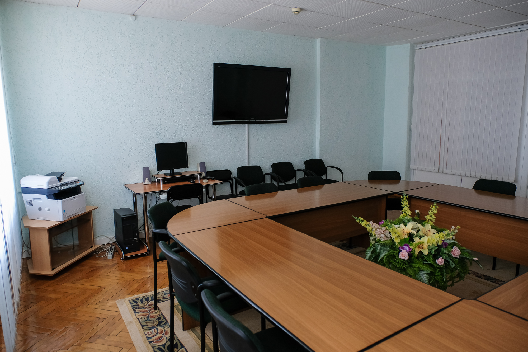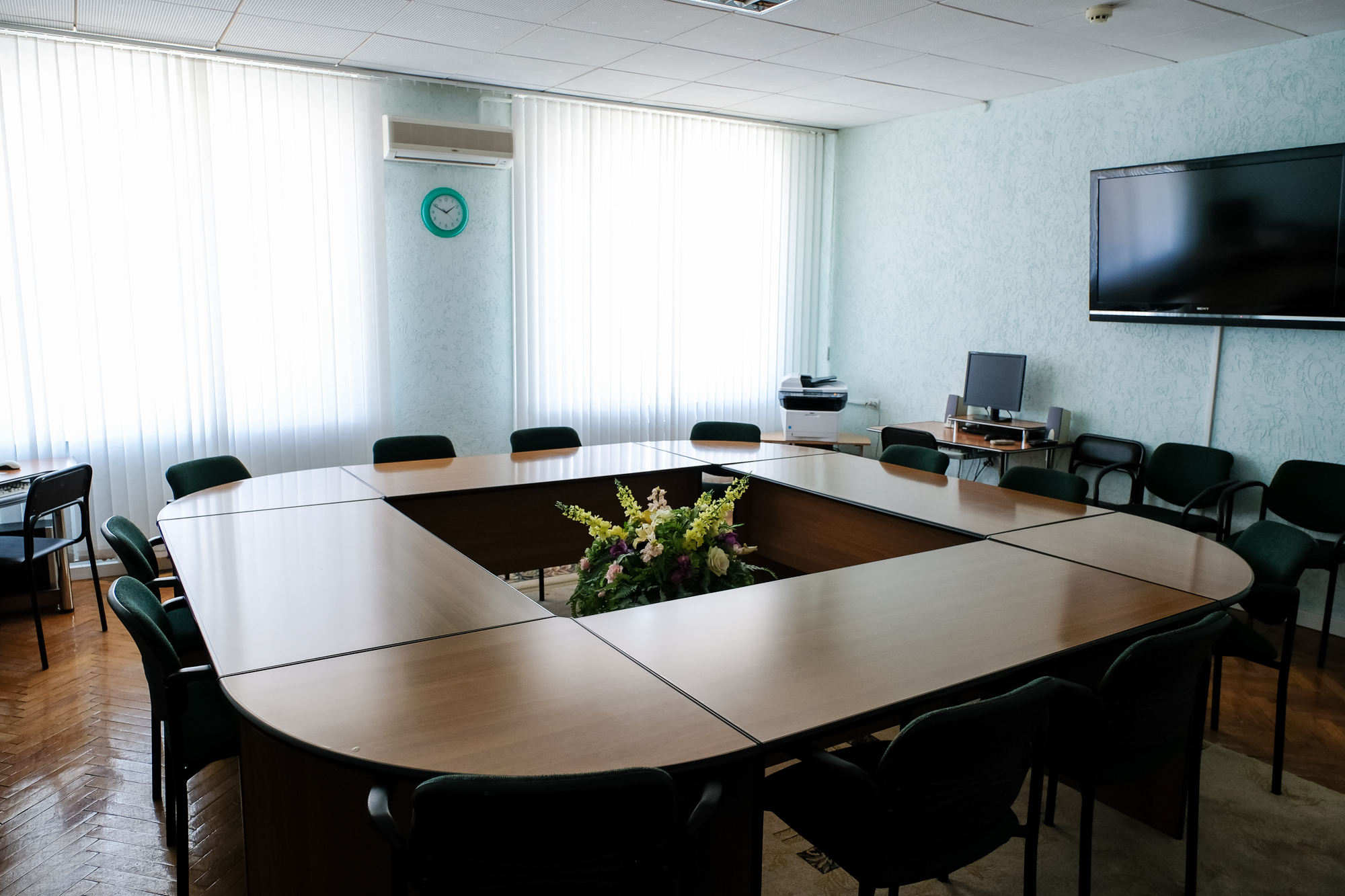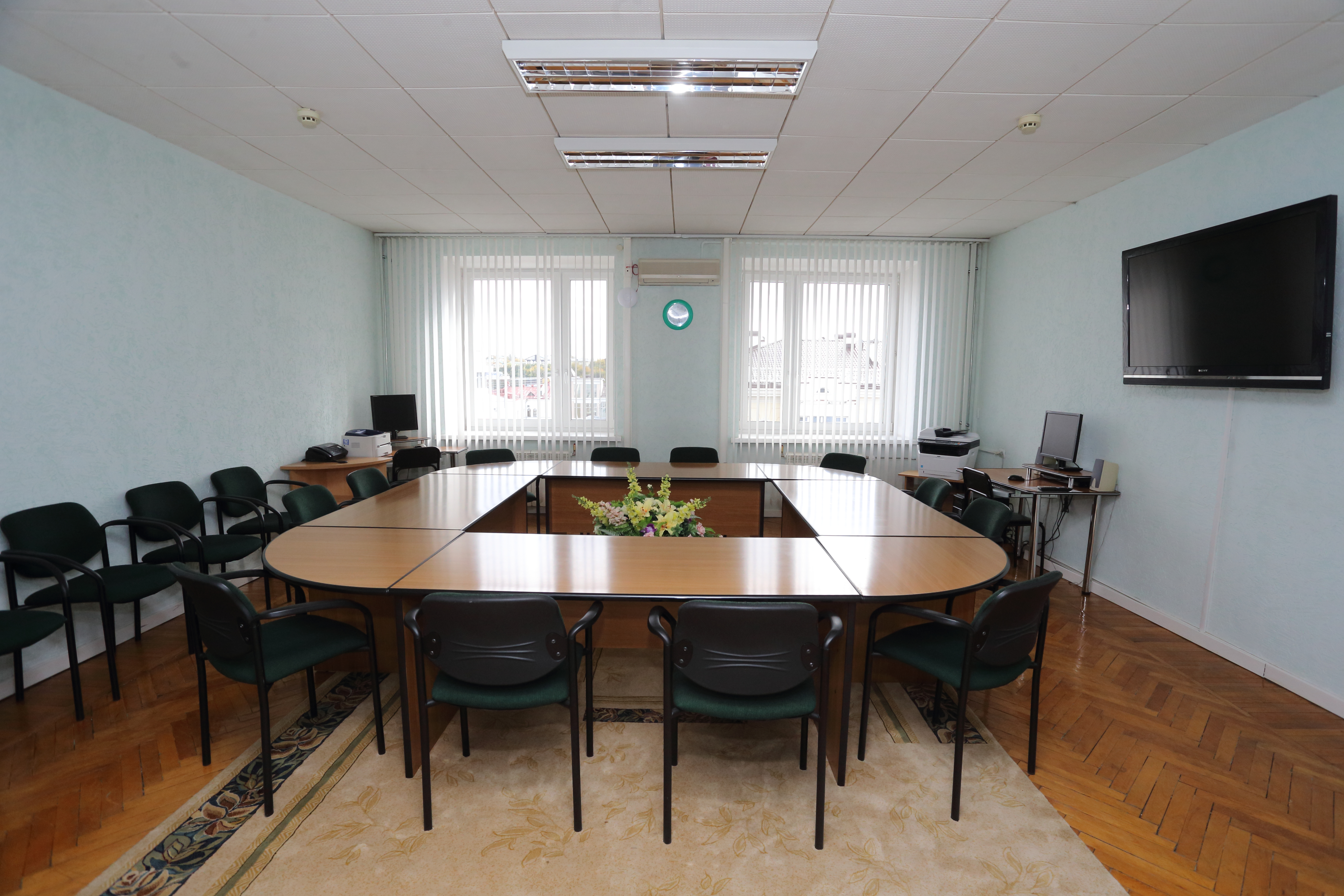 Конференц-зал («круглый стол») вместимостью 20 чел. предназначен для проведения деловых встреч, совещаний, переговоров.