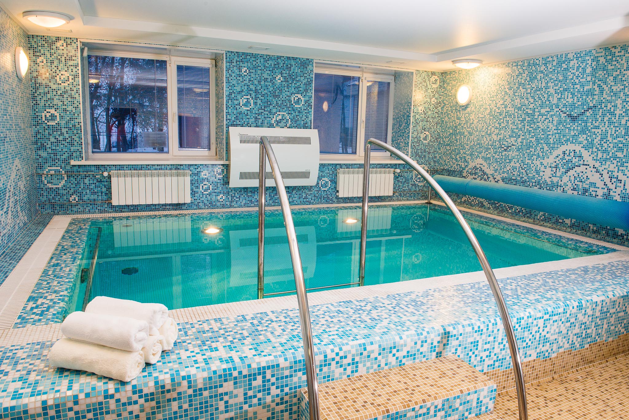 Большая комната отдыха с музыкальным центром и караоке, бассейн с гидромассажем и уютная парная.